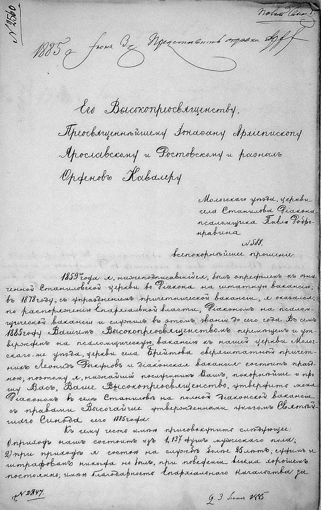 Мологского уезда, церкви села Станилова диакона Павла Добронравина покорнейшее прошение.