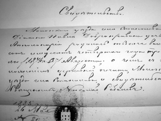 «Свидетельство. Мологского уезда села Станилова Диакона Павла Добронравина дочь Аполлинария родилась тысяча восемьсот семьдесят четвертого года третьего / 1874 г. 3-го/ Августа; о чем с приложением церковной печати, Мологского уезда села Станилова, и свидетельствует Священник Николай Соболев. 1885 год. 26 Мая»