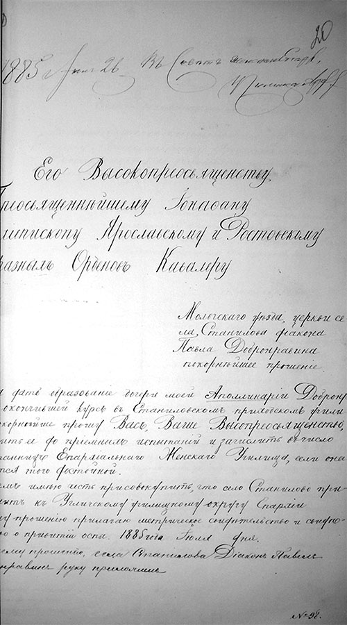 Прошу дать образование дочери моей Аполлинарии Добронравиной… Покорнейше прошу Вас, Ваше Высокопреосвященство, допустить ее до приемных испытаний и зачислить в число воспитанниц Епархиального Женского училища, если она окажется того достойной. Имею честь присовокупить, что село Станилово принадлежит к Угличскому училищному округу Епархии.
