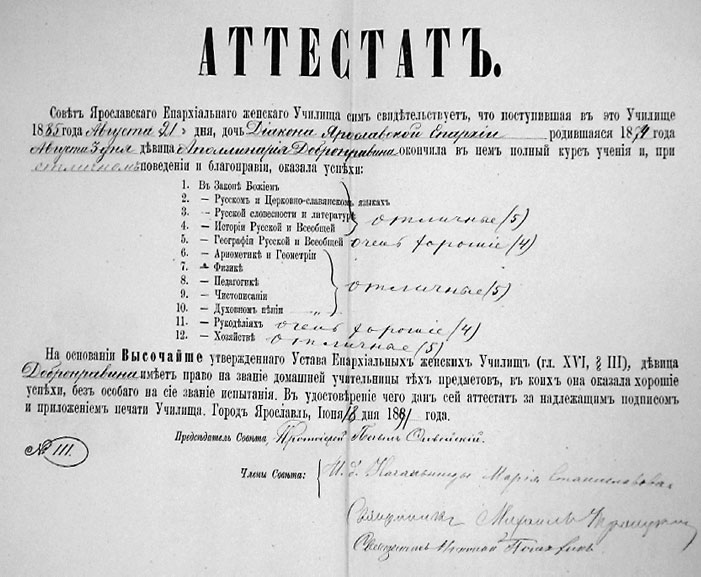 «Аттестат. Совет Ярославского Епархиального женского Училища сим свидетельствует, что поступившая в это Училище 1885 года Августа 21 дня дочь Диакона Ярославской епархии, родившаяся 1874 г. Августа 3 дня девица Аполлинария Добронравина окончила в нем полный курс учения и, при отличном поведении и благонравии, оказала успехи:… отлично, очень хорошо, отлично, очень хорошо, отлично. На основании Высочайше утвержденного Устава Епархиальных женских Училищ (…), девица Добронравина имеет право на звание домашней учительницы тех предметов, в коих она оказала хорошие успехи, без особого на сие звание испытания. В удостоверение чего дан сей аттестат за надлежащим подписом и приложением печати Училища. Город Ярославль, Июня 18 дня 1891 года»