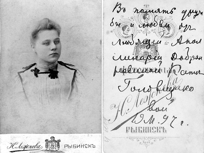 «В память дружбы и любви от любящей Аполлинарии Добронравиной Кате Головщиковой 19 М. 97 г.»