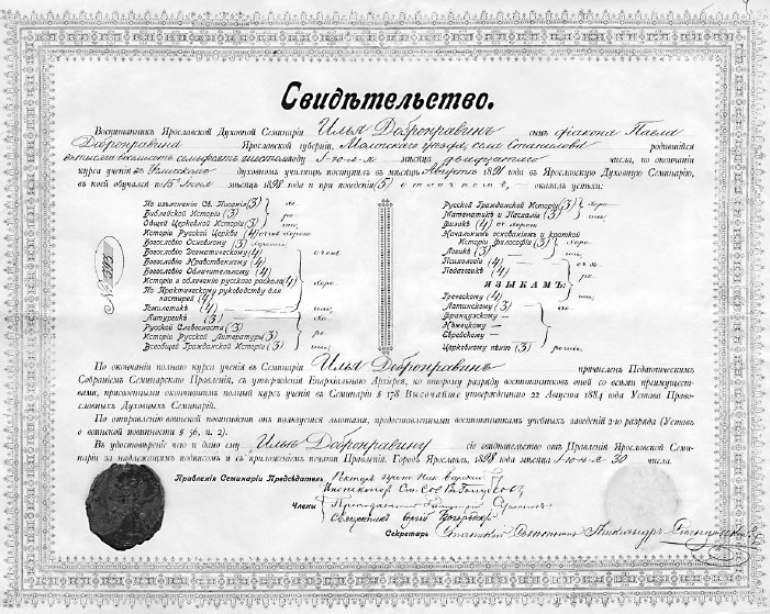 На отношение Правления Вологодской духовной Семинарии от 28 августа сего 1892 года за № 794 Правление Ярославской духовной Семинарии имеет честь уведомить, что … ученик Алексей Добронравин во время своего обучения в оной к начальствующим и учащим был всегда почтителен и вежлив, с товарищами общителен, приветлив и ласков; каких-либо непристойных поступков для ученика Семинарии не допускал и со стороны поведения вообще считался всегда вполне благонадежным к продолжению образования в Семинарии.