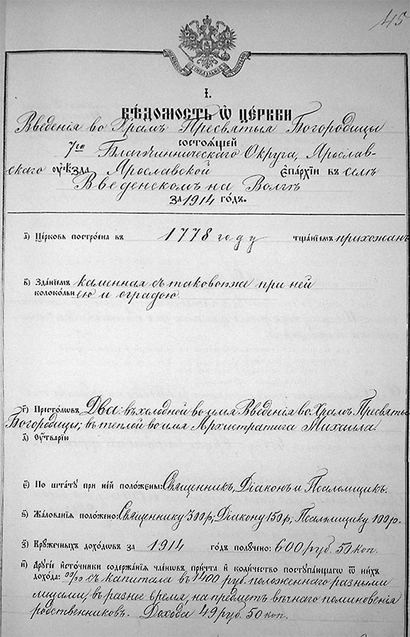 Ведомость о церкви Введения во Храм Пресвятой Богородицы, состоящей 7-го Благочиннического Округа, Ярославского уезда, Ярославской епархии в селе Введенском на Волге за 1914 год