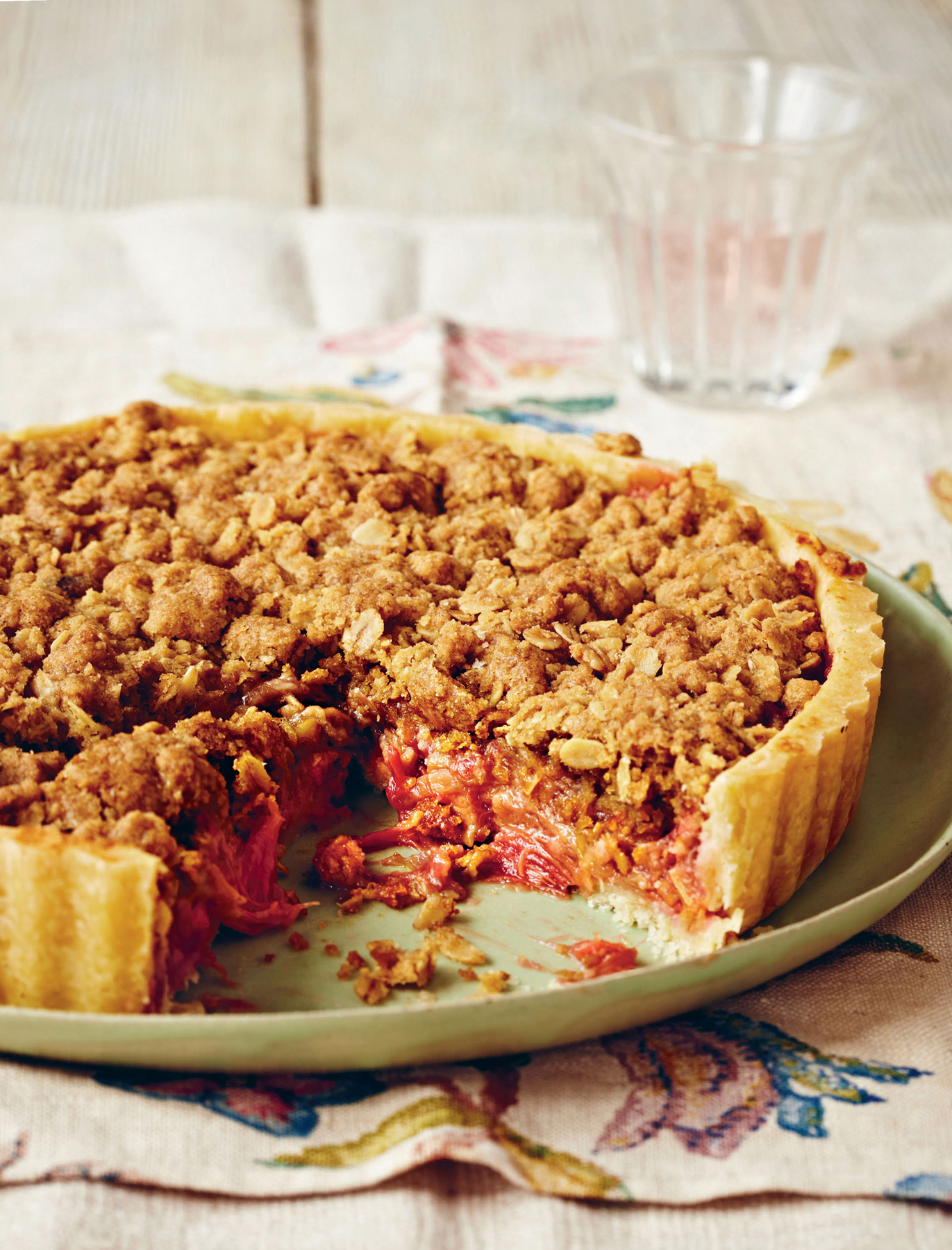 Crumble the streusel topping evenly over the tart, pressing down gently with your fingertips to fill any large gaps, then bake in the oven for 35–40 minutes or until the streusel is a deep gold and the pastry is cooked. Leave the tart in its tin on a wire rack to cool for 10 minutes before serving.