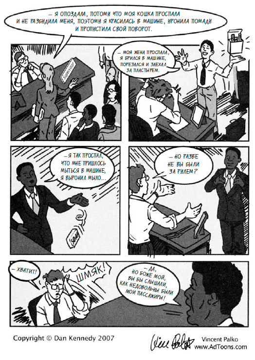 На стене в кабинете Шелби висел большой лист бумаги с пронумерованным списком оправданий для опоздавших на работу. «№ 14: Моя собака проглотила ключи от моей машины. № 37: У меня критические дни. № 41: Я сел не на тот автобус…» Шелби говорил, что список сильно экономит время.