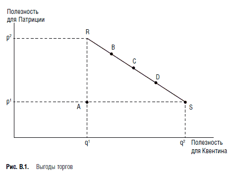На рисунке вы видите прямую линию, соединяющую крайнюю точку, в которой Патриция может получить всю доступную дополнительную полезность (p2), включая ту, которой оба переговорщика располагали в точке А, и крайнюю точку, где вся доступная дополнительная полезность (q2) достается Квентину, причем в каждой из этих точек другой переговорщик не получает ничего. Эту прямую можно рассматривать как линию прохождения границы. На пограничной линии RS находятся точки, представляющие все возможные варианты распределения дополнительной полезности между Патрицией и Квентином. Никто из них не может переместиться за пределы этой пограничной линии, так как в этой области комбинации полезностей не доступны. Переговорщики могут распределять полезности между собой, только находясь на этой границе или внутри нее.