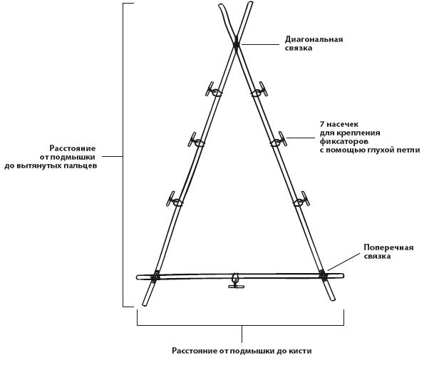 Мое любимое приспособление – это рамы для переноса. Их можно использовать как отдельно, так и вместе с другими предметами. Внешние рамы очень универсальны, но сегодня многие забывают об этом их свойстве. Самая популярная самодельная рама на сегодняшний день – это рама Ройкрофта, названная в честь Тома Ройкрофта, туриста, который научил технике изготовления такой рамы Морса Кочански, известного канадского эксперта по выживанию в диких условиях. Эта простая конструкция в виде треугольника собирается за считаные минуты и прослужит долгое время, если крепежи сделаны правильно, а материал подобран с умом. Чтобы сделать такую раму, сначала вырежьте три ее элемента (их легко сделать из ели твердой породы), а затем следуйте данным инструкциям, чтобы скрепить рамку: