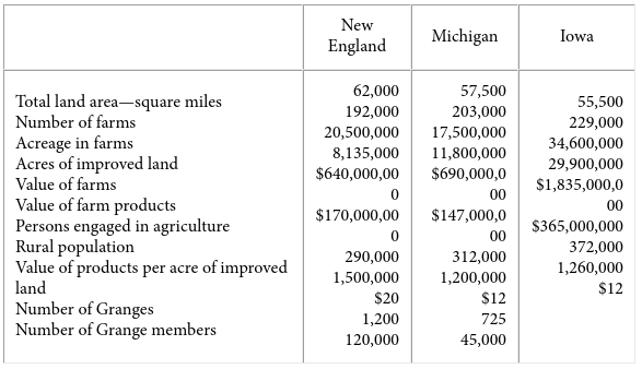 (1) The importance of New England agriculture. In the appended table is attempted a comparison between New England as a unit, the state of Michigan representing an average agricultural state, and the state of Iowa representing the foremost agricultural state. The figures, taken from the Census of 1900, are given in round numbers. Such a table is not conclusive as to agricultural conditions. But it is very suggestive as to the importance of New England agriculture both industrially and socially. It will be seen that, with an area only a little larger than Michigan, New England compares in every respect favorably with that average state and, in some respects, excels it, while it excels both Michigan and Iowa by 65 per cent. in gross value of product per acre of improved land.