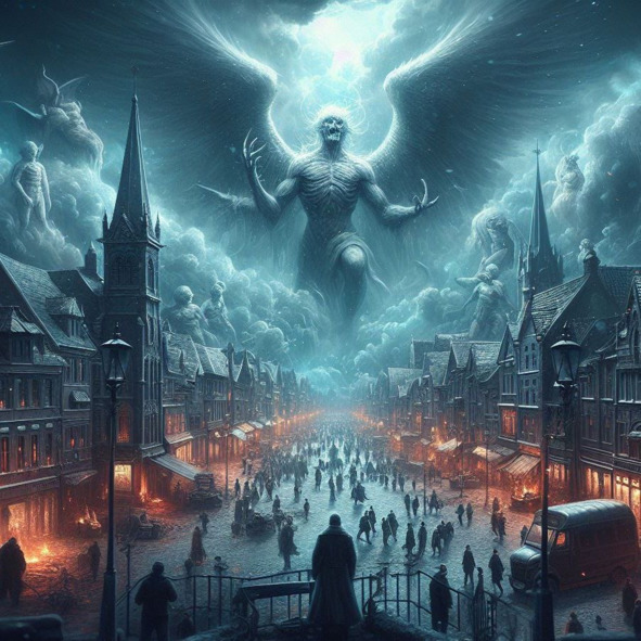 Из густого дыма, как посланник небес, спустился Ангел, облаченный в блеск света и чистоты. Его крылья, словно созданные для защиты и спасения, защекотали Лизу, выручая от опасности.