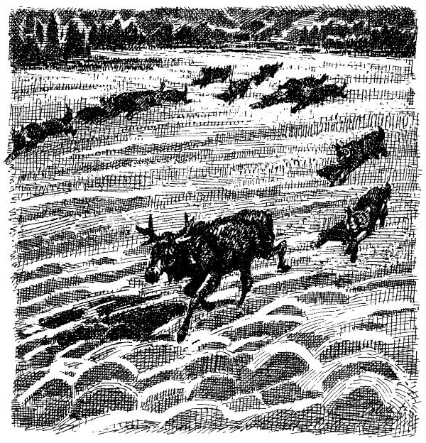 В эту ночь волчья стая снова охотилась – возможно, уже другая стая, которая начала охоту в нескольких милях[3] отсюда и, преследуя лань, достигла замерзшего озера. Было светло как днем, и с опушки леса Казан первым увидел, как на расстоянии четверти мили от него на лед озера выбежала преследуемая лань. Стая из дюжины волков уже приняла свое роковое построение в форме подковы, и два вожака бежали почти на одном уровне с ланью, по обе стороны, готовые замкнуть круг.