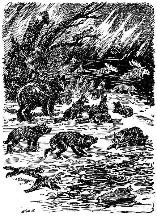 В ту же секунду подскочила Серая Волчица и, продолжая драку где-то под брюхом Казана, сомкнула свои челюсти на задней лапе кошки. Хрустнула кость. Рысь, оказавшись под двойной тяжестью, отскочила назад, волоча за собой волчицу и Казана. Но тут она упала на одного из дикобразов, и в тело ее вонзились его острые иглы. Еще прыжок, она вырвалась на свободу и бросилась навстречу дыму. Казан не стал преследовать ее. Серая Волчица подошла к нему и начала лизать ему шею, где темно-бурая его шкура окрасилась свежей кровью. Куница лежала как мертвая, только поглядывала на всех своими злыми черными глазками. Дикобразы продолжали болтать что-то, словно прося пощады. Затем густая черная удушливая завеса дыма низко опустилась над отмелью, и пахнуло жаром, как из паровозной топки.