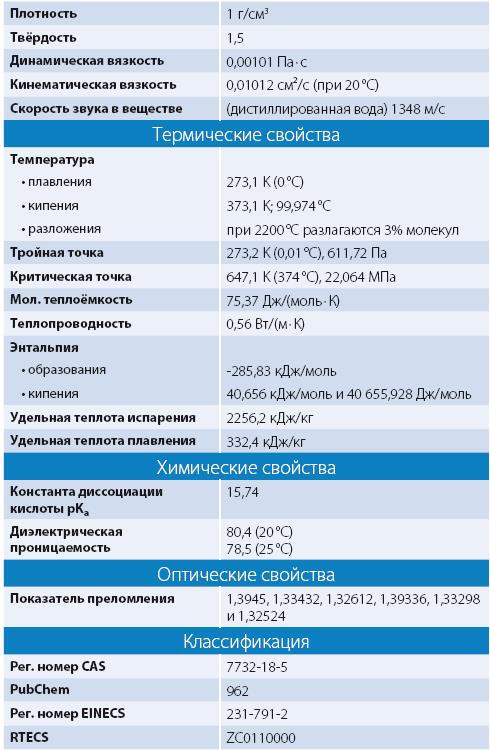 Вода (оксид водорода, гидроксид водорода, химическая формула – Н2О) – бинарное неорганическое соединение, молекула которого состоит из двух атомов водорода и одного – кислорода, которые соединены между собой ковалентной связью. При нормальных условиях представляет собой прозрачную жидкость, не имеющую цвета (при малой толщине слоя), запаха и вкуса. В твёрдом состоянии называется льдом (кристаллы льда могут образовывать снег или иней), а в газообразном – водяным паром. Вода также может существовать в виде жидких кристаллов (на гидрофильных поверхностях)[100].[101]