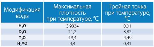 Физические свойства разных изотопных модификаций воды при различных температурах:[117]