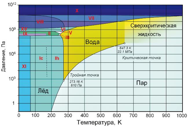 Фазовая диаграмма воды: по вертикальной оси – давление в Па, по горизонтальной – температура в Кельвинах. Отмечены критическая (647,3 K; 22,1 МПа) и тройная (273,16 K; 610 Па) точки. Римскими цифрами отмечены различные структурные модификации льда