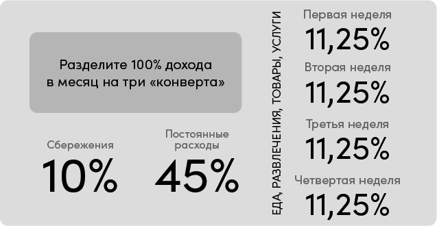 Оставшиеся 45 % от первоначальной суммы – это деньги на еду, развлечения, покупку товаров и услуг. То, что вы можете варьировать. Нужно разделить сумму третьего «конверта» на четыре части – по количеству недель в месяце. Тратьте каждую часть ТОЛЬКО в рамках недели.