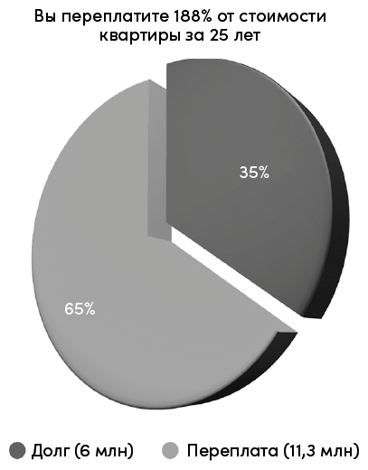Одни лишь комиссионные банка за 25 лет составят 11,3 млн рублей. То есть за квартиру стоимостью 6 млн вы заплатите 17,3 млн. Переплата 188 %!
