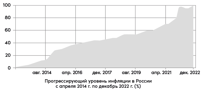 Взгляните на график инфляции ниже. За 10 лет с 2013 г. российский рубль обесценился почти на 100 %.