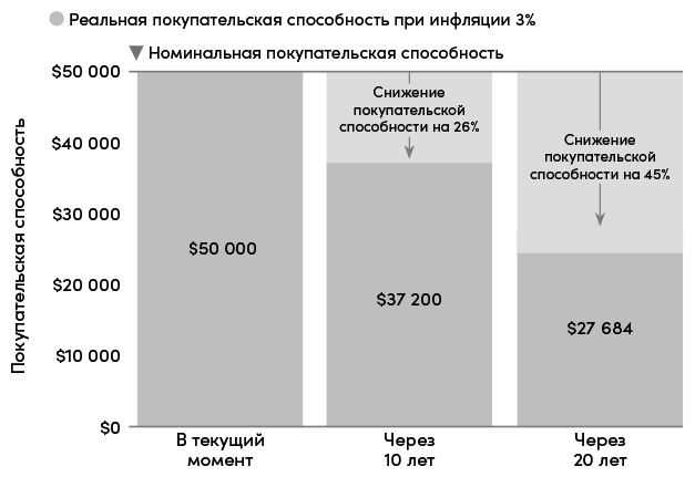 С инвестициями все иначе. При правильном подходе, который я описываю в своей книге, вы сможете обгонять инфляцию. Платежеспособность ваших денег будет значительно увеличиваться. Особенно на длинной дистанции.