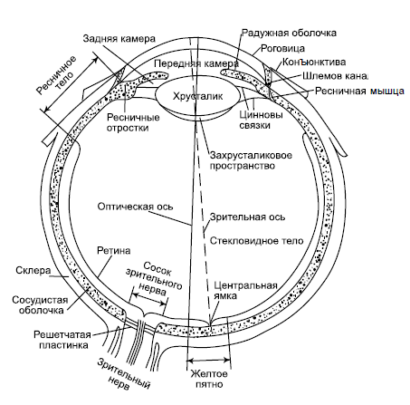 Глазное яблоко имеет почти шаровидную форму примерно два с половиной сантиметра в диаметре. Оно состоит из нескольких основных оболочек: склера – внешняя оболочка, сосудистая оболочка – средняя, сетчатка – внутренняя.