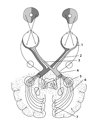 3 – перекрещенные волокна зрительного нерва; 4 – зрительный тракт;