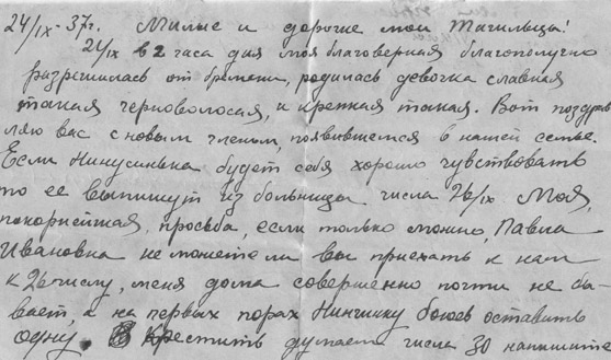 21/IХ в 2 часа дня моя благоверная благополучно разрешилась от бремени, родилась девочка славная такая, черноволосая и крепкая… Поздравляю вас с новым членом, появившимся в нашей семье. Если Нинусинька будет себя хорошо чувствовать, то ее выпишут из больницы числа 26/IХ. Моя покорнейшая просьба, если только можно, Павла Ивановна, не можете ли Вы приехать к нам к 26 числу? Меня дома совершенно почти не бывает, а на первых порах Нинчинку боюсь оставить одну. Крестить думаем числа 30 октября. Напишите, могут ли приехать Леля и Коля. Потом вот еще. Ниночка у меня все просит яблочков, а последних здесь нет. Если можно, то привезите. Я пока здоров, работы у меня очень и очень много. Пишу и ужасно тороплюсь, потому что много дел.