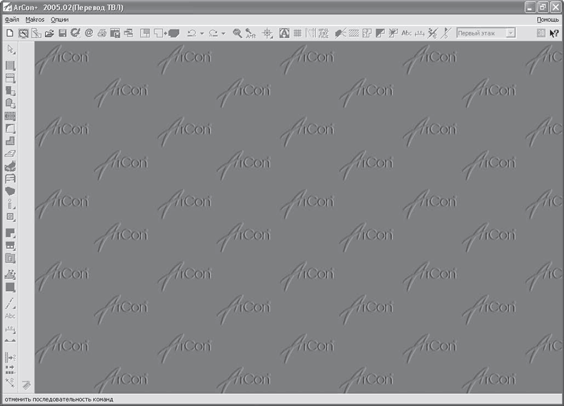 Главное окно программы ArCon 2005, открываемое сразу после запуска, показано на рис. 1.3. Оно содержит только две панели инструментов (одну вертикальную и одну горизонтальную) и три пункта меню, управляющих системными настройками и настройками нового проекта. Пока на панелях инструментов активны всего лишь три кнопки, позволяющие создать новый проект, запустить мастер проектов, называемый в программе Ассистент проектов, или открыть (загрузить) ранее сохраненный проект.