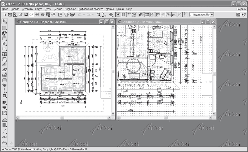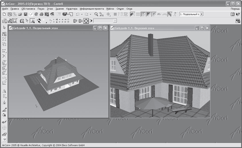Для удобства рассмотрения интерфейса вы также можете загрузить один из примеров, поставляемых с программой, – все равно в этой главе не будет никаких попыток что-либо отредактировать или создать. Файлы проектов, поставляемых с программой, находятся в папке \ArCon\Projekte той директории, куда вы установили программу (по умолчанию это корневой каталог диска С:\).