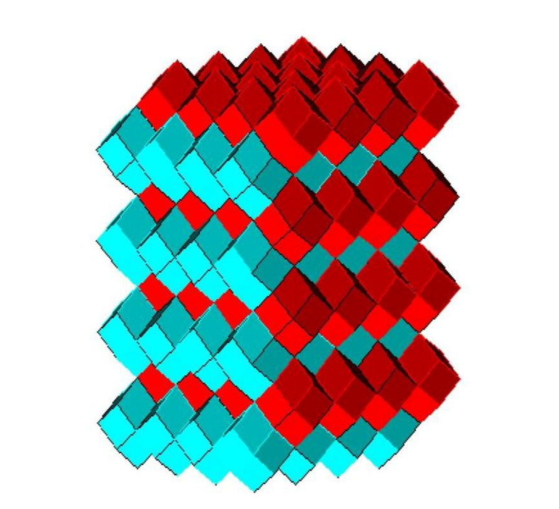 Как видно из рисунка 6, в пределах всего слоя однотипные кванты пространства не контактируют друг с другом своими гранями, а контактируют исключительно с квантами противоположного типа.
