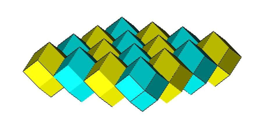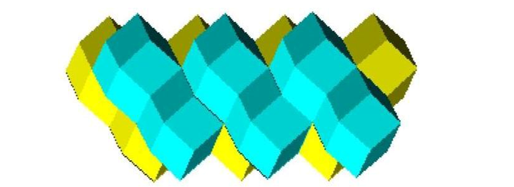Очевидно, что в двух соседних слоях квантов пространства верхний слой южными зонами своих квантов контактирует с северными зонами квантов нижнего слоя. В этом случае неминуемо каждый квант одного слоя будет контактировать своими гранями с двумя однотипными квантами другого слоя, образуя две сети сообщающихся квантов пространства (см. рисунок 7).