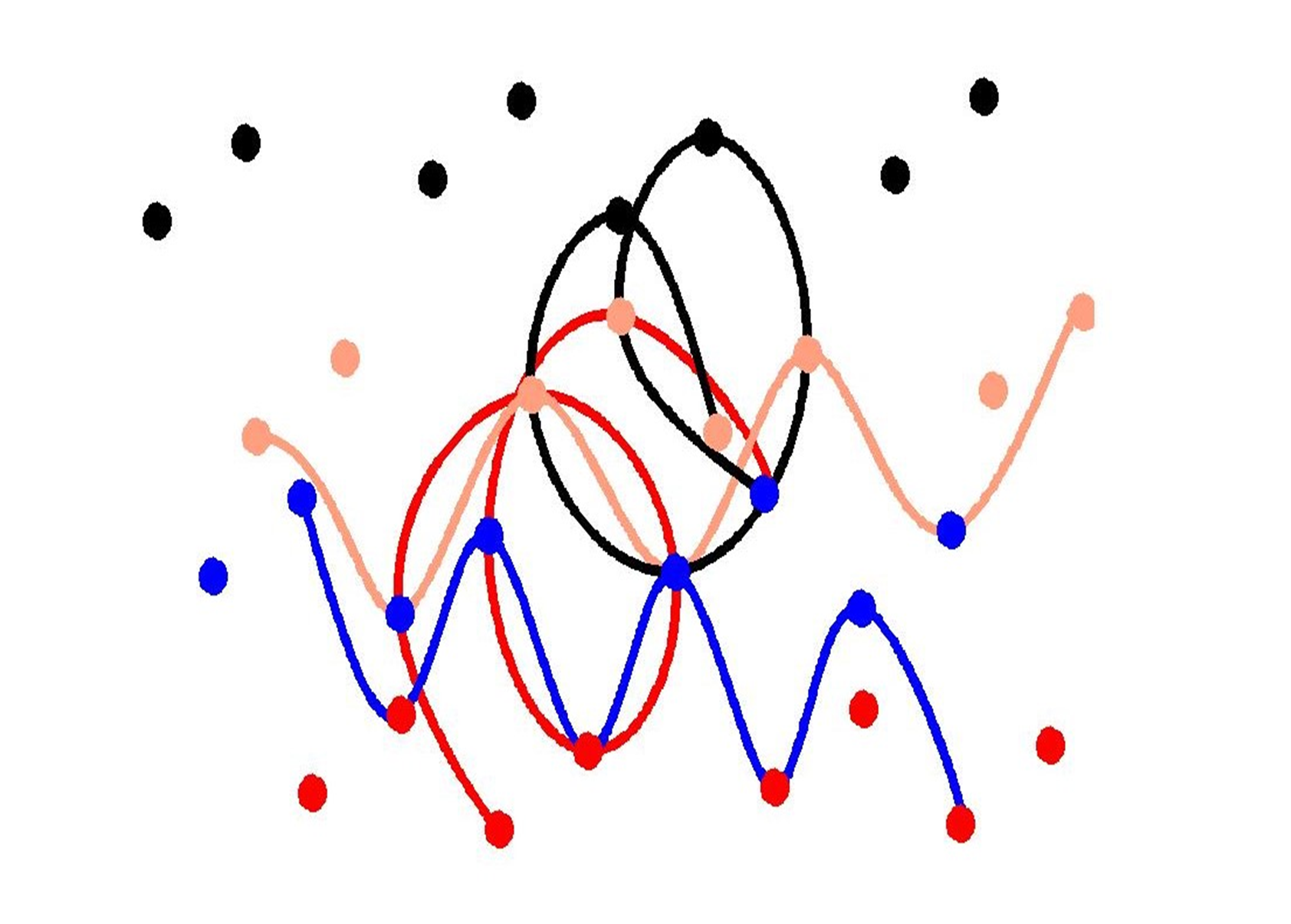 Если центры квантов пространства этих пространственных сетей соединить плавной пространственной линией, то вместо ломаных линий получатся волновые и винтовые линии, как это видно из рисунка 10. Для большей наглядности на рисунке 10 представлена лишь одна из двух сетей с двумя волновыми линиями: красного (проходящего через шары) и чёрного цветов и двумя винтовыми линиями: оранжевого (проходящего через шары) и синего цветов, расположенными во взаимно перпендикулярных направлениях.