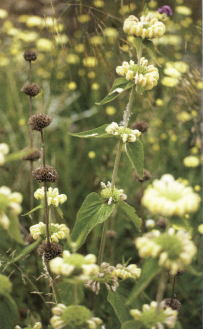 Here are some favourite sun-loving plants in my garden: French lavender (Lavandula stoechas), globe thistle (Echinops sphaerocephalus ‘Niveus’) and the soft yellow Phlomis russeliana.