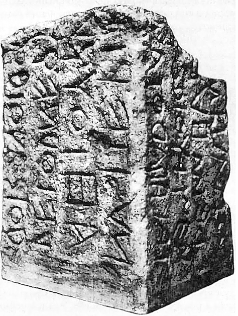 В 1899 г. на Форуме Археолог Джакомо Бони обнаружил квадратную площадку, вымощенную черным мрамором, а под нею – обломки сосудов, костяные и глиняные фигурки и остатки оружия. Но самой интересной вещью там был фрагмент столба с надписью. И эта надпись – древнейший известный нам памятник латинской письменности[44], его датируют примерно VI в. до н. э.