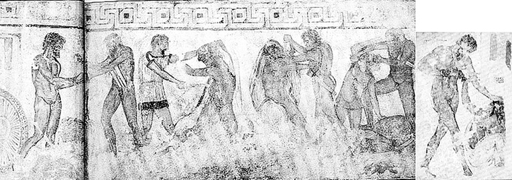 Перед нами довольно кровавая сцена сражения (или убийства?). Благодаря подписям, мы знаем имена изображенных мужчин: слева Мастарна освобождает Целия Вибенну. А брат (?) Целия, Авл Вибенна, (он один здесь изображен в одежде, и мы не знаем, почему) убивает кого-то родом из города Фалерии[65].