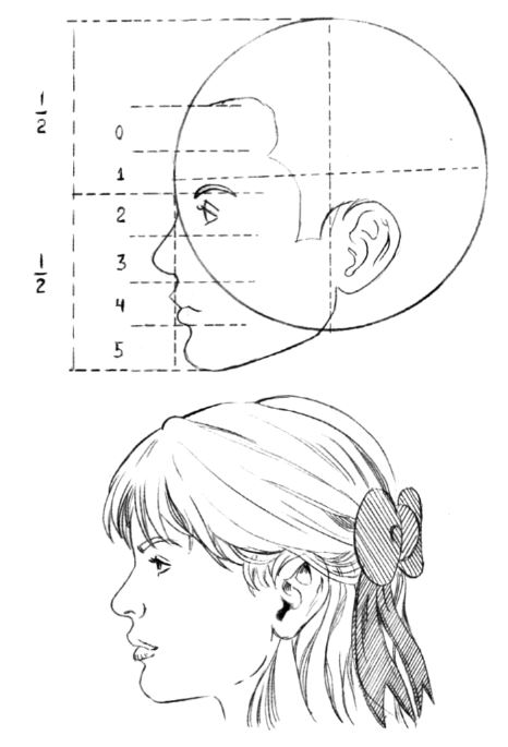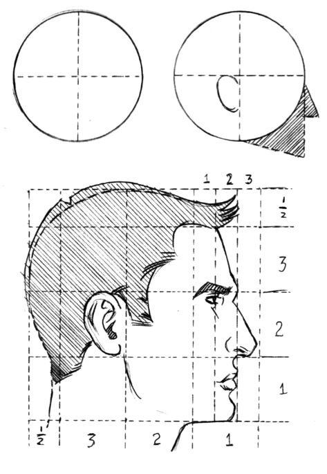 При рисовании лица в профиль мы используем окружность, разделенную на две половины. С помощью остроугольного треугольника в нижней части окружности изобразим подбородок. Высота и длина лица пропорционально одинаковы (3 1/2). Расстояния между частями лица такие же, как и при рисовании лица в анфас.