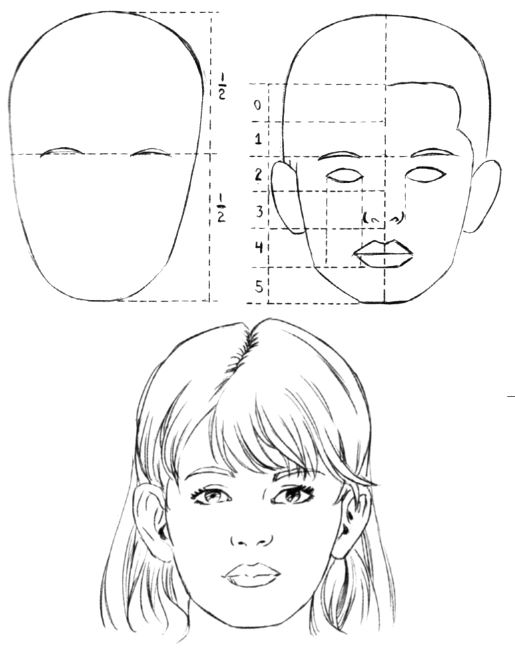 Как вы заметили на предыдущем рисунке, мы теперь делим голову на две равные части, а не на три, как при изображении лица взрослого человека.