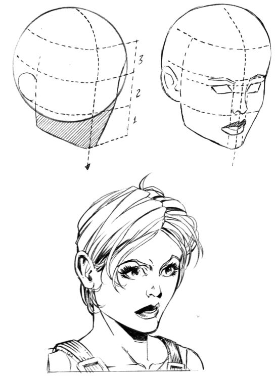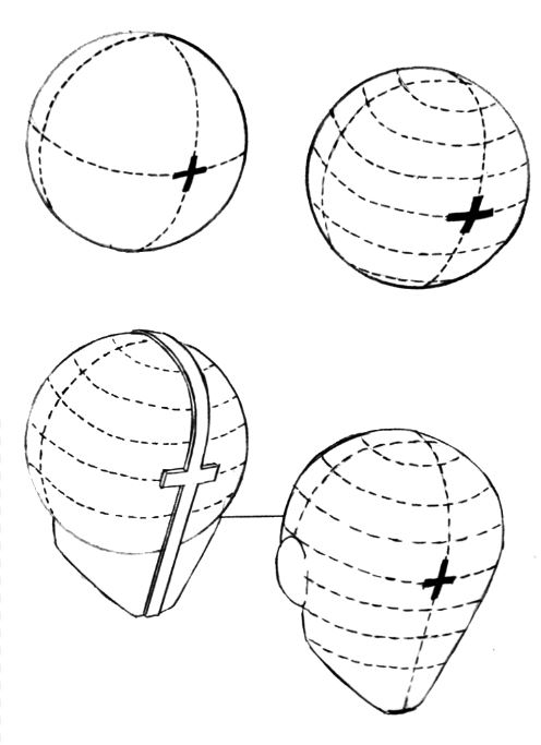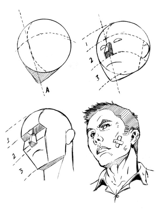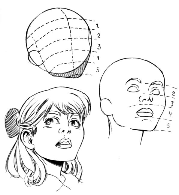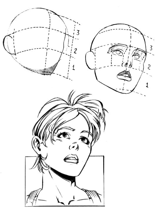 Если голова персонажа слегка поднята вверх, то область подбородка уменьшается по сравнению с ситуацией, когда голова наклонена вниз. Линия бровей по-прежнему делит сферу пополам в горизонтальной плоскости. Обратите внимание на тень, возникающую в области между глазами и бровями. Использование штриховки в этом месте позволяет придать объем изображению.