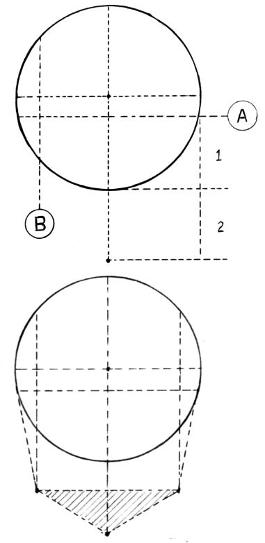 На этом рисунке мы видим сферу, разделенную пополам, а затем на сегменты. Обратите внимание на крест, который создается, когда линии, которые делят сферу на две половины, пересекаются. Удлиним вертикальные линии креста и добавим к сфере то, что придаст ей форму головы, все результирующие контрольные линии будут служить для правильного размещения элементов лица.