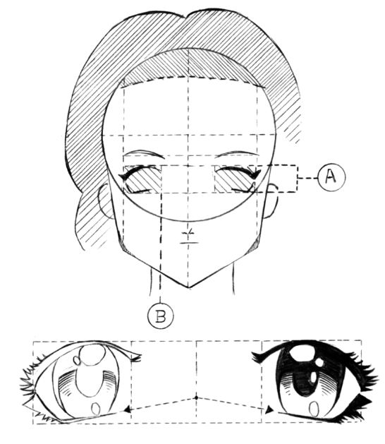 Линия A на предыдущем рисунке будет линией бровей, а линия B будет внешней границей глаз, расстояние между глазами больше, чем ширина глаза, нос изображаем ниже границы окружности, а рот рисуем очень близко к носу. Рот при этом маленький. Обратите внимание, что сегмент «A» – это высота глаз. Глаза в стиле манга прорисовываются очень подробно. Заштрихованная область – это область, которую будет занимать волосы.
