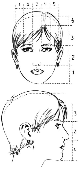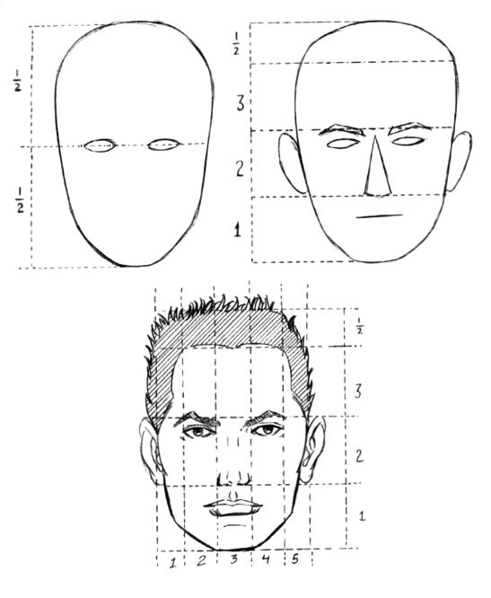 Глаза расположены строго посередине лица, как мы видим на рисунке. Расстояние между бровями и носом, между носом, а также между бровями и местом начала роста волос, одинаково и обозначено цифрами 1 , 2. 3. Половина этого расстояния – это расстояние от линии роста волос до макушки. Расстояние между глазами равно ширине глаза, также расстояние от глаза до виска составляет один глаз.