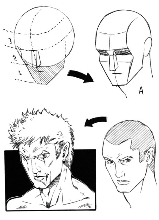 Подобно тому, как мы рисовали лицо в профиль, добавляем к сфере то, что будет подбородком. Линия 3, которая делит сферу пополам по горизонтали, будет линией бровей. Затем мы определяем части лица с помощью геометрических фигур (А), остальное – вопрос детализации.