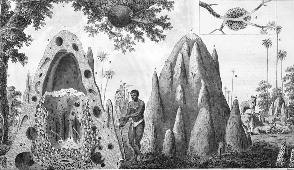 Для исследования термитников Смитмен со своими проводниками, вооружившись кирками и мотыгами, проделывали пробоины в глиняных стенках. Затем руками разгребали обломки и заползали внутрь, чтобы рассмотреть, как там все устроено. Делать все надо было очень быстро, потому что через несколько секунд после первых ударов начиналось угрожающее потрескивание – «более резкие и быстрые звуки, чем тиканье часов», вспоминал Смитмен. Это был сигнал тревоги. Спустя мгновения из глубины появлялись стаи термитов и бросались в атаку. Укусы их очень болезненные, и босоногие проводники моментально спасались бегством. Европейцам поначалу было попроще, но термиты весьма быстро пробирались в обувь и вцеплялись в ноги, оставляя на белых носках мелкие кровавые следы (истинный ученый, Смитмен позже исследовал пятна и пришел к выводу, что в среднем каждый термит за каждый укус выпускает количество крови, равное его собственному весу). Смитмен вскоре на личном опыте слишком хорошо узнал боль от укусов различных насекомых, но терпение позволило ему в невероятных подробностях познакомиться с интерьером холмов буга-баг. На самом деле его описания читаются как учебник по архитектуре. Он упоминает башни, купола, ниши, катакомбы, воздушные перекрытия и готические арки. Он также предположил (правильно), что форма термитников действует как воздуховод, закачивая свежий воздух и поддерживая постоянную температуру внутри. С энтузиазмом, хотя и несколько пренебрежительно, он заявляет, что любой термитник являет собой «образец старания и находчивости, так же превосходящий самые смелые амбиции человека, как собор Св. Павла превосходит индейскую хижину».