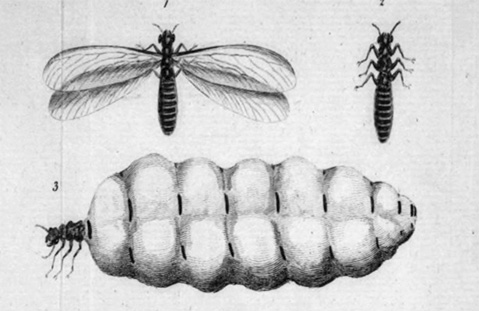 Гигантская королева термитов (номер 3), маленькое тело, раздувшееся в яичный мешок, из которого каждые сутки появляется до 80 000 яиц (рисунок Генри Смитмена).