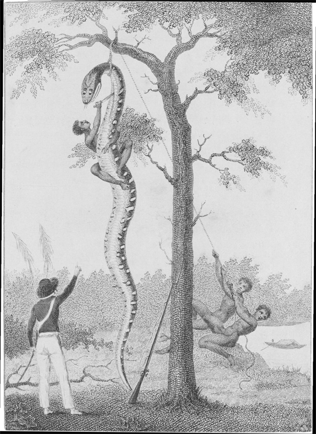 Раб по имени Дэвид вынужден залезть на дерево и снять шкуру с удава для своего хозяина Джона Стедмана. Как ни странно, это рисунок поэта Уильяма Блейка.