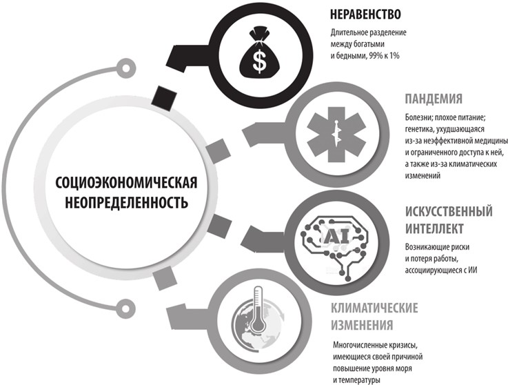 Рисунок 4. Экономическая неопределенность, вызванная неравенством, пандемиями и изменением климата, заставит капитализм решать общие проблемы, связанные с доходами отдельных лиц (источник: собственная иллюстрация автора)