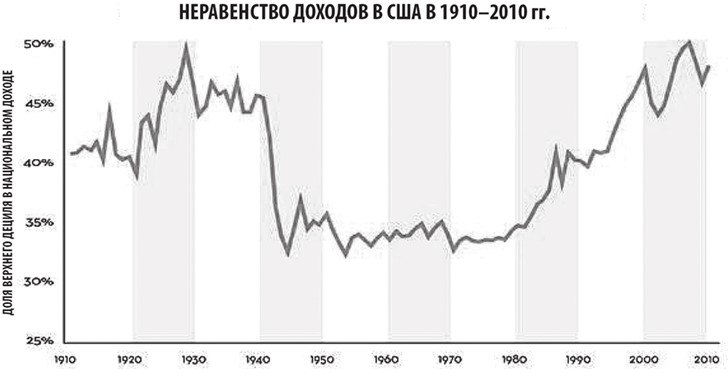 Неравенство в той или иной стране можно измерить при помощи так называемого коэффициента Джини. Коэффициент Джини – это число от 0 до 1, где 0 соответствует миру, в котором все получают одинаковый доход, а 1 – миру, где один человек получает весь доход (у всех остальных ноль). В Соединенных Штатах этот коэффициент ясно говорит о том, что неравенство сегодня такое же, как и во время Великой депрессии 1930-х годов, а может быть, даже хуже, учитывая покупательную способность.