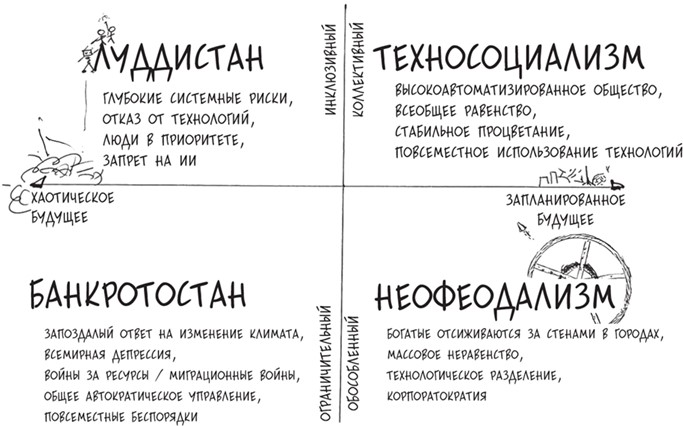 Если не техносоциализм, то что может стать альтернативой для нашей планеты в ближайшие 50 лет? Мы видим четыре возможных исхода для современного общества. Они покоятся на двух широких осях: коллективное против индивидуального и хаотичное будущее против упорядоченного, как это показано на рисунке 6.