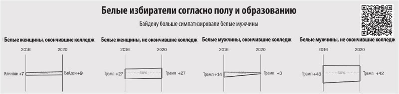 В конечном счете успех Трампа в 2016 году (и серьезная поддержка в 2020-м) свелся к тому, что 60–64 % белых избирателей из рабочего класса (не имеющих высшего образования и представляющих треть взрослого населения США) поддержали его, а не Клинтон[20] или Байдена[21]. Четыре критических фактора обозначились как независимые предикторы успеха Трампа в ночь выборов.