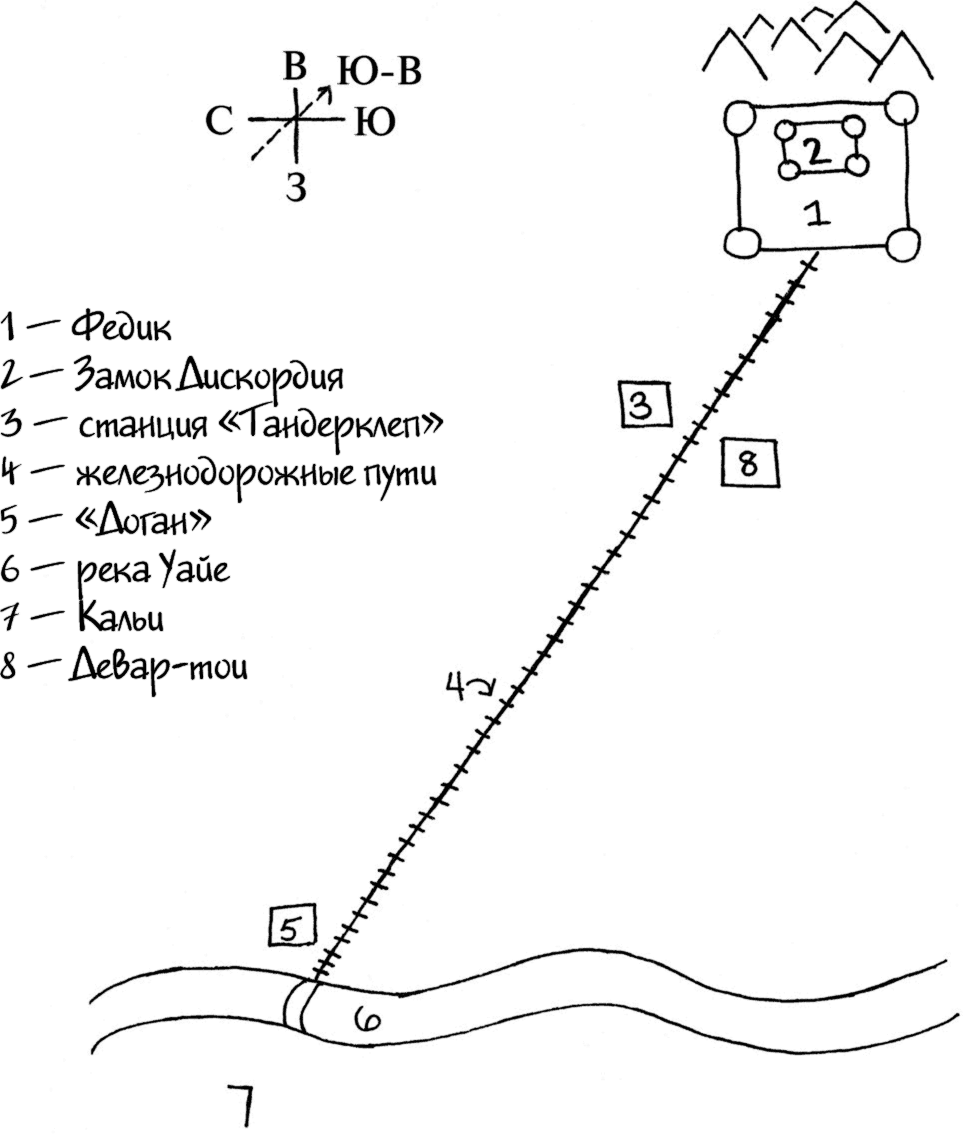 – Федик. – Роланд указал на 1, потом провел короткую линию к 2. – А это замок Дискордия, с дверьми под ним. Из того, что нам известно, их там много. Должен быть коридор, которым мы можем пройти отсюда туда, под замок. А теперь, Сюзанна, расскажи, каким путем шли Волки и что они делали. – Он протянул ей мелок в футляре.