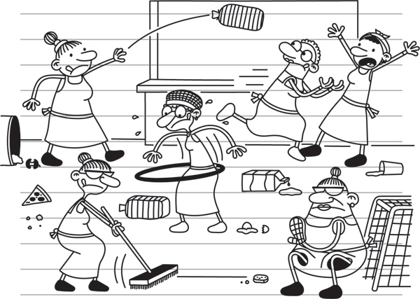 Самое неприятное – что мы недавно узнали: нам придётся соревноваться со ВЗРОСЛЫМИ. Уборщики и уборщицы пришли к завучу и сказали, что хотят создать СВОЮ команду, ведь заслуживают свободный от школы день не меньше, чем мы, учащиеся.