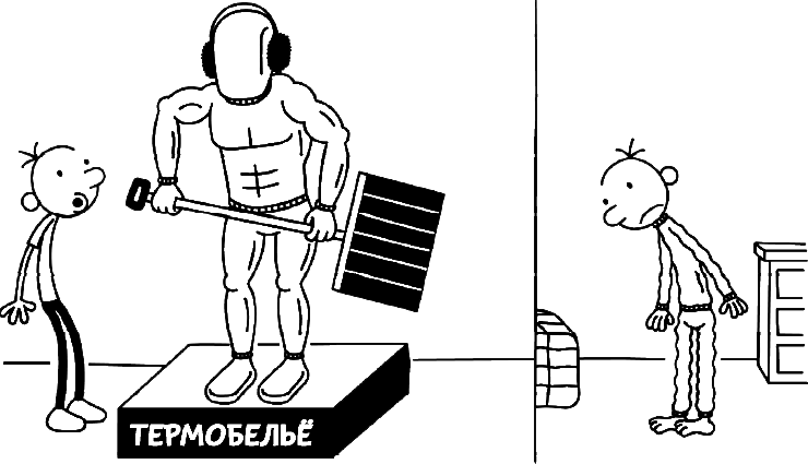 Я ТЕРПЕТЬ НЕ МОГУ термобельё: оно неудобное и я чувствую себя в нём КАК ДУРАК. Термобельё классно смотрится на манекенах, которые стоят в торговых центрах, но когда Я надеваю его, то становлюсь похожим на супергероя, который вышел на пенсию.
